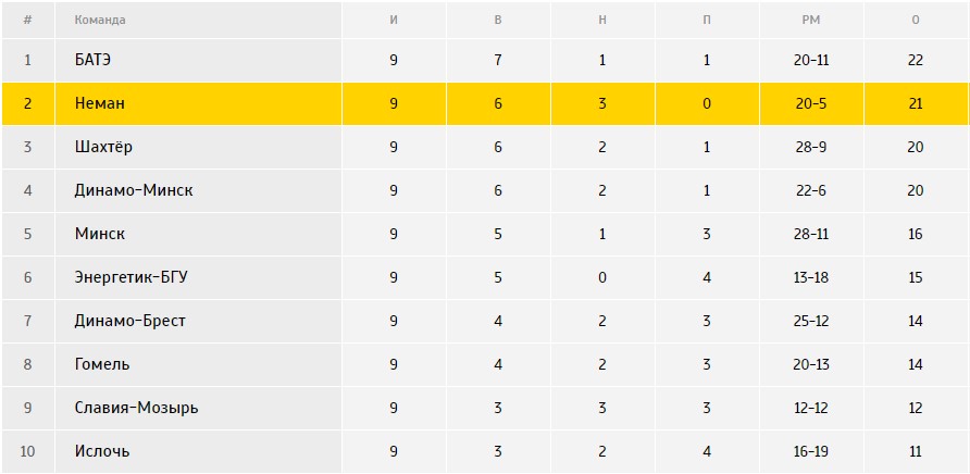 Вчера и позавчера прошли пять стартовых матчей 10 тура. Все наши непосредственные конкуренты отыграли без очковых потерь. Наступающий на пятки минский «Энергетик-БГУ» дома обыграл «Городею» со счётом 4:1, дубль минского «Динамо» в гостях крупно переиграл «Витебск» 6:3, БАТЭ на выезде одолел «Гомель» 2:0, а «Шахтёр» дома переиграл с таким же счётом «Дняпро».
