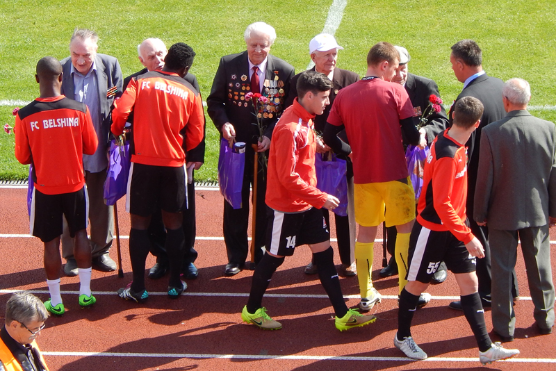 Игроки хозяев поздравили ветеранов Бобруйска, а наша команда поблагодарила всех аплодисментами.