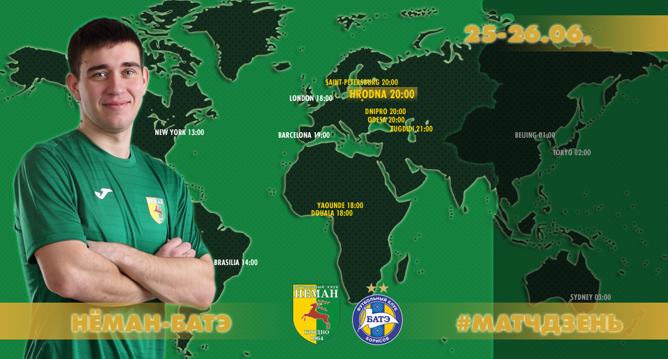 Матч 14-го тура Беларусбанк — чемпионата между командами «Неман» – БАТЭ (Борисов) состоится в воскресенье, 25 июня. Встреча пройдёт в Гродно на главной арене ЦСК «Неман». Стоимость билета – 4 рубля (дети – 1,5 рубля). Начало встречи в 20:00.