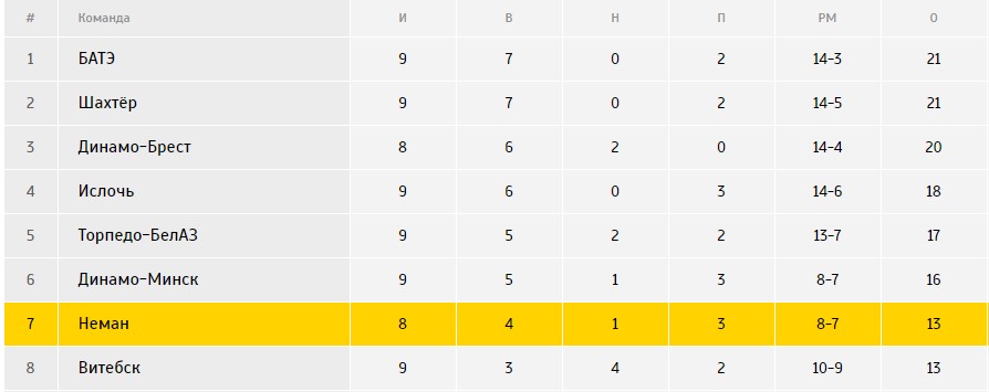Матчи «Немана»: Гомель (гости) – 3:2 (Н'Дженг, Кантария, Легчилин), Шахтёр (дома) – 0:3, Ислочь (гости) – 0:1, Витебск (дома) – 1:0 (Алыкулов), Динамо-Минск (гости) – 1:0 (Жуковский), Торпедо-БелАЗ (дома) – 0:0, Дняпро (гости) – 3:0 (Яблонский-2, Евдокимов), БАТЭ (дома) – 0:1.