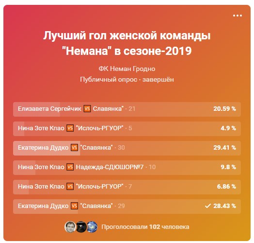 Предварительно на голосование мы вынесли 6 из 88 забитых командой в чемпионате мячей: три эффектных удара Нины Зоте Кпао, два удара Екатерины Дудко и один точный удар Елизаветы Сергейчик. Борьба за лучший забитый мяч развернулась между двумя последними авторами, за футбольные шедевры которых были отданы более 85% голосов.