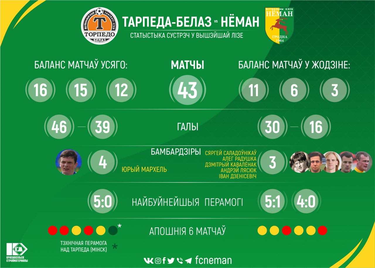 Если же брать всю историю противостояния двух клубов в чемпионате Беларуси, то здесь преимущество на стороне наших гостей. Команды в чемпионате страны провели 43 встречи, 12 из которых завершились победой гродненской команды. Общая статистика встреч: +12=15-16, мячи 39-46 (полная картина противостояния «Немана» и «Торпедо-БелАЗ»). Если же брать матчи сыгранные только в Жодино, то здесь перевес наших соперников очень внушительный: +3=6-11, мячи 16-30.