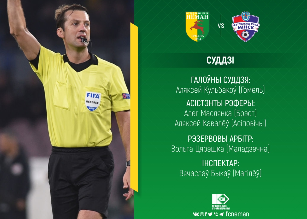 Судит сегодняшний матч будет Алексей Кульбакоў из Гомеля. В этом сезоне это второй матч жёлто-зелёных, на котором он будет работать. В первом матче, который состоялся 14 сентября, мы в гостях проиграли «Торпедо-БелАЗ» со счётом 0:1. Всего матчи нашего клуба Кульбакоў судил 33 раза (+10=5-18, разница мечей 32-46). В восьми из их «Неман» встречался с «Минском» - 6 раз в Гродно и дважды в Минске: 3:1 (2007), 2:1 (2009), 1:3 (2011, Минск), 4:4 (2012, Минск), 2:1 (2012), 0:1 (2014), 2:4 (2014), 0:1 (2016).