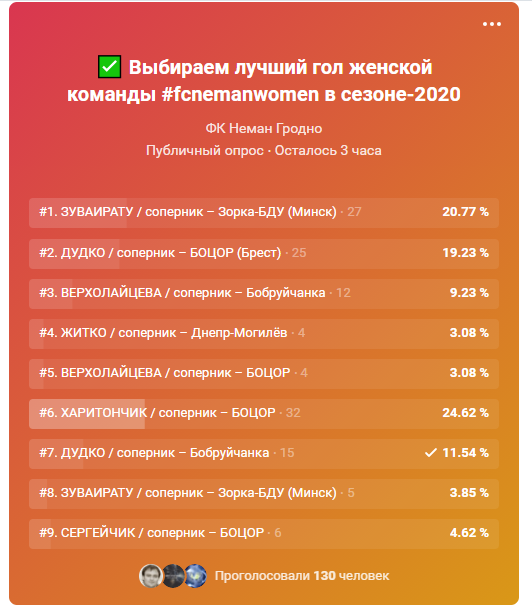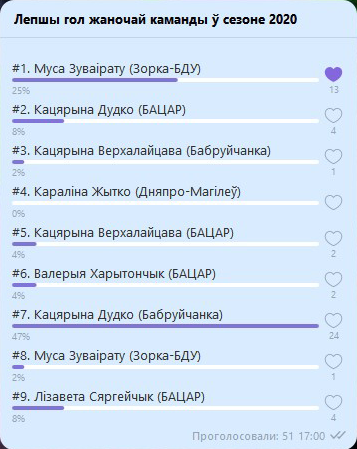 Предварительно на голосование мы вынесли 9 из 80 забитых командой в сезоне мячей: по два красивых мяча от Екатерины Дудко, Муссы Зуваирату и Екатерины Верхолайцевой, а также по одному эффектному удару от Елизаветы Сергейчик, Валерии Харитончик и Екатерины Житко.