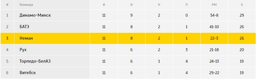 Диспозиция перед встречей дублирующих составов (полная таблица): «Неман» - 3 место (26 очков, мячи 22-3), БАТЭ - 2 место (26 очков, мячи 41-10).