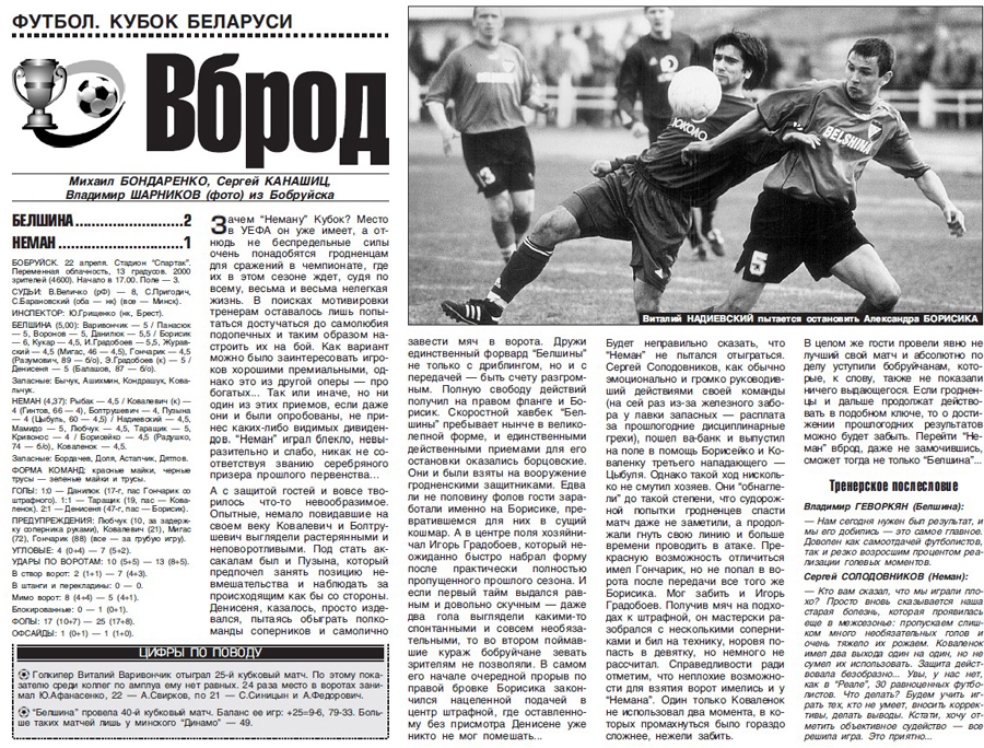 «...Не успела стрелка секундомера совершить полный круг, как последовала расплата. Рыбак установил достаточно хлипкую «стенку» и пушка Болтрушевича выстрелом с 30 метров изменила цифры на табло. Разохотившиеся гости, в рядах которых солировали братья Градобоевы, не стали откладывать вопрос о победителе в долгий ящик и собственноножно «похоронили» «Неман». После антракта первую скрипку играли уже хозяева. Гродненцы подали десяток угловых, столько же раз попадали в створ ворот, но то был не их день. На всякий случай заметим, что этим соперникам ещё играть в чемпионате - причём в последнем туре...» (Прессбол №122-123 от 3 октября 2000 года, Владимир Козырев).