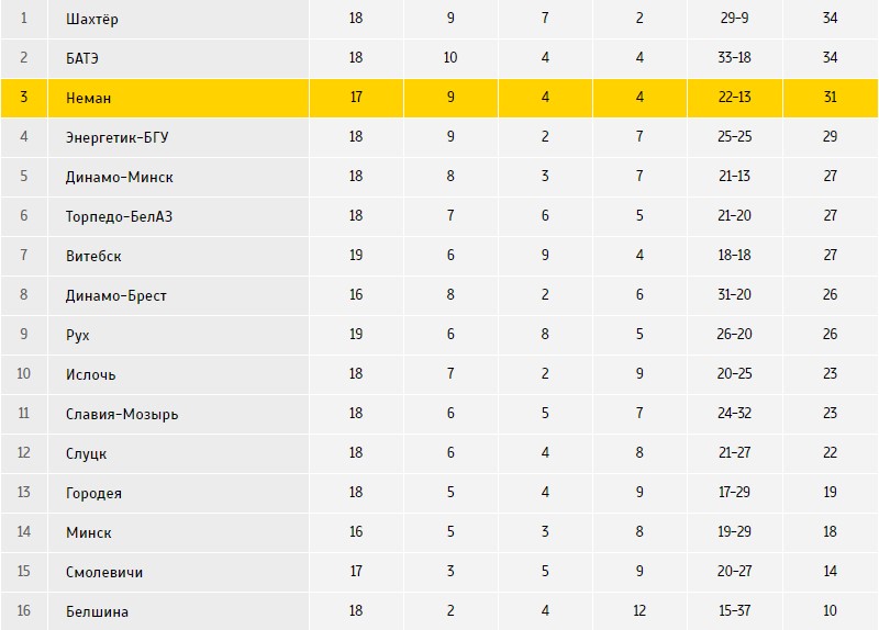 Перед очной встречей «Неман» находится на 3 месте, а «Белшина» расположилась на 16 строке в турнирной таблице.