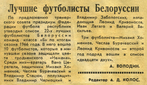 Более подробно о карьере и достижениях нашего игрока и тренера в любой момент можно узнать на странице раздела ЖЗЛ. Жёлто-зелёные люди: Леонид Кривоносов.